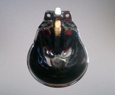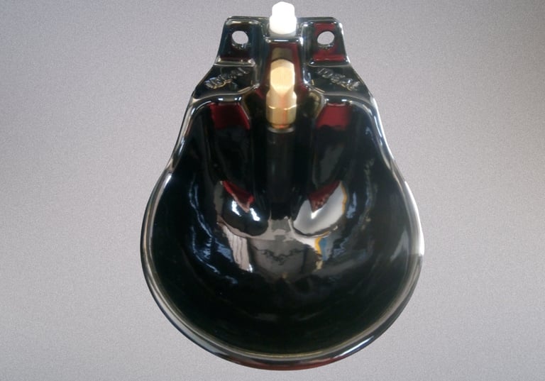 Bebedouro com design elegante fabricado em ferro fundido com acabamento a preto esmaltado. Este bebedouro funciona a partir de uma válvula de toque nasal.