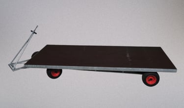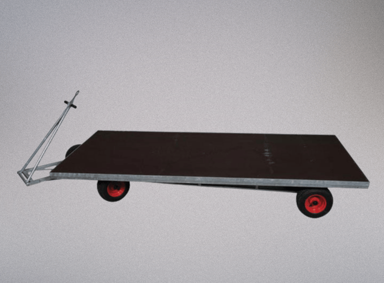 Estrutura em aço galvanizado com 3,50x1,50mts, com direção giratória com caixa de esferas, barra de tração em forma de tesoura, uma plataforma de madeira compensada revestida de resina e rodas pneumáticas e uma capacidade de carga de 1500Kg