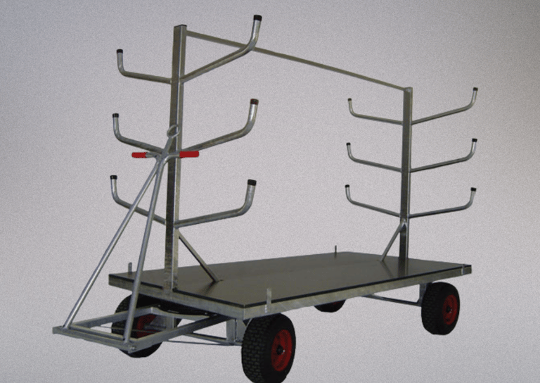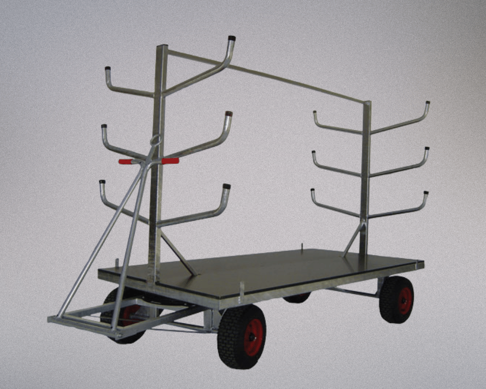 Estrutura em aço galvanizado com capacidade até 120 varas, com direção giratória com caixa de esferas, barra de tração em forma de tesoura, uma plataforma de madeira compensada revestida de resina e rodas pneumáticas e travão de mão automático nas rodas dianteiras.