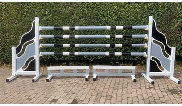 Obstáculos com design pré concebido (conforme imagens) com estrutura em alumínio, para uma maior durabilidade, e varas de 3,00mts. Incluem suporte de varas e bandeiras