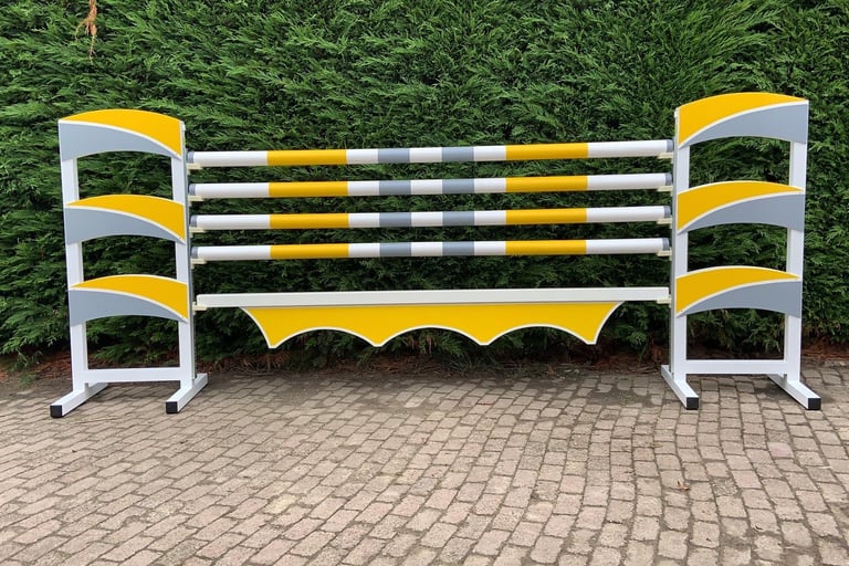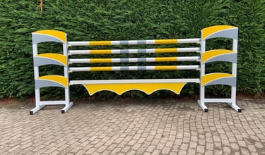 Obstáculos com design pré concebido (conforme imagens) com estrutura em alumínio, para uma maior durabilidade, e varas de 3,00mts. Incluem suporte de varas e bandeiras