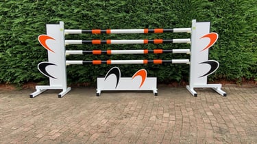 Obstáculos com design pré concebido (conforme imagens) com estrutura em alumínio, para uma maior durabilidade, e varas de 3,00mts. Incluem suporte de varas e bandeiras