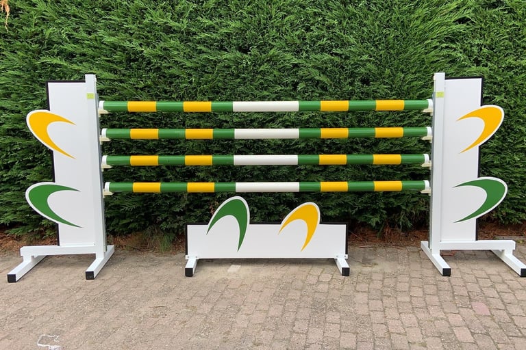 Obstáculos com design pré concebido (conforme imagens) com estrutura em alumínio, para uma maior durabilidade, e varas de 3,00mts. Incluem suporte de varas e bandeiras