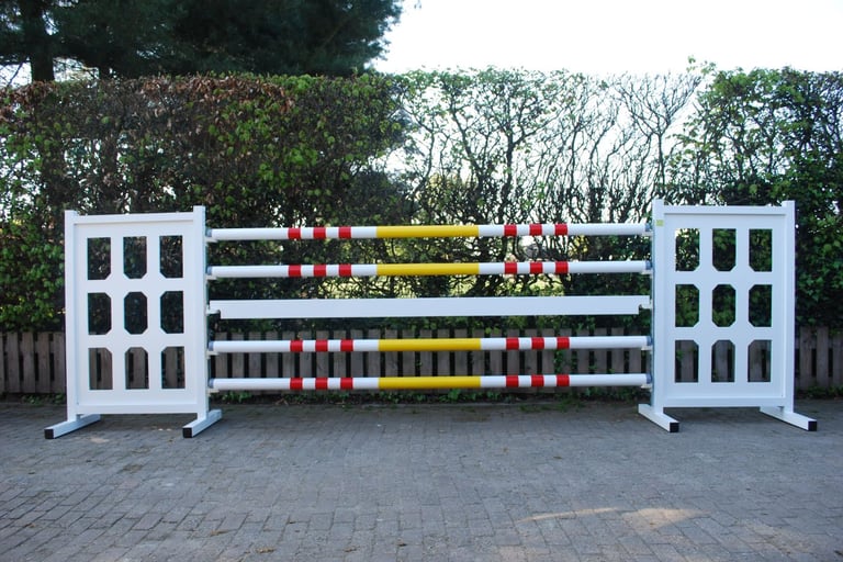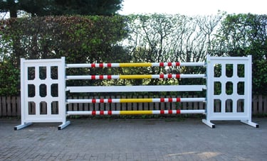 Obstáculos com design pré concebido (conforme imagens) com estrutura em alumínio, para uma maior durabilidade, e varas de 3,00mts. Incluem suporte de varas e bandeiras