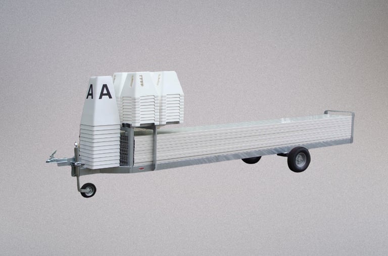 Este Trailer é o ideal para armazenar e transportar todos os acessórios da arena de ensino. As réguas e os cones podem ser colocados no reboque de forma rápida e segura, sendo que existe um espaço também para um conjunto de cones para letras na frente do trailer. Este trailer é facilmente rebocável por um mini-trator ou moto-4.