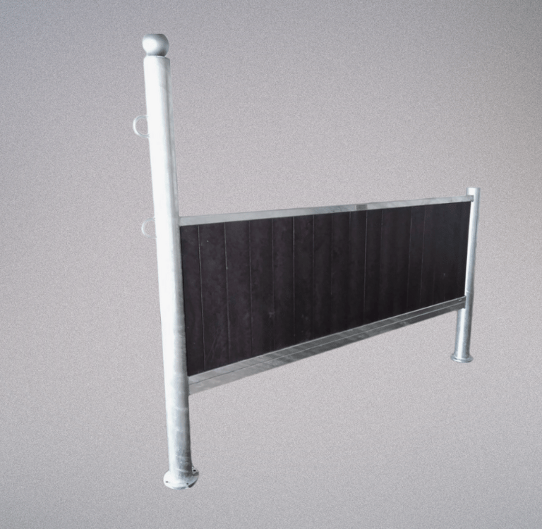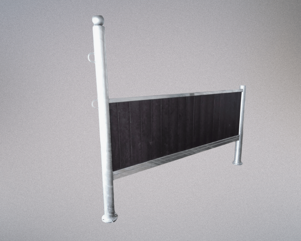 Stall front made of hot-dip galvanized high-strength steel, with two tie points for the horse.The client can choose to add high-resistance plastic composite boards (as shown in the image) or bamboo, and may also choose the top finish (silver or gold ball, or flat cap).