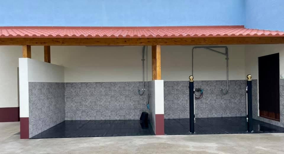 Hot-dip galvanized iron shower stand, includes hose and shower-style spray gun. Ideal for your wash area.
