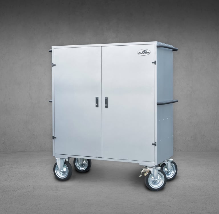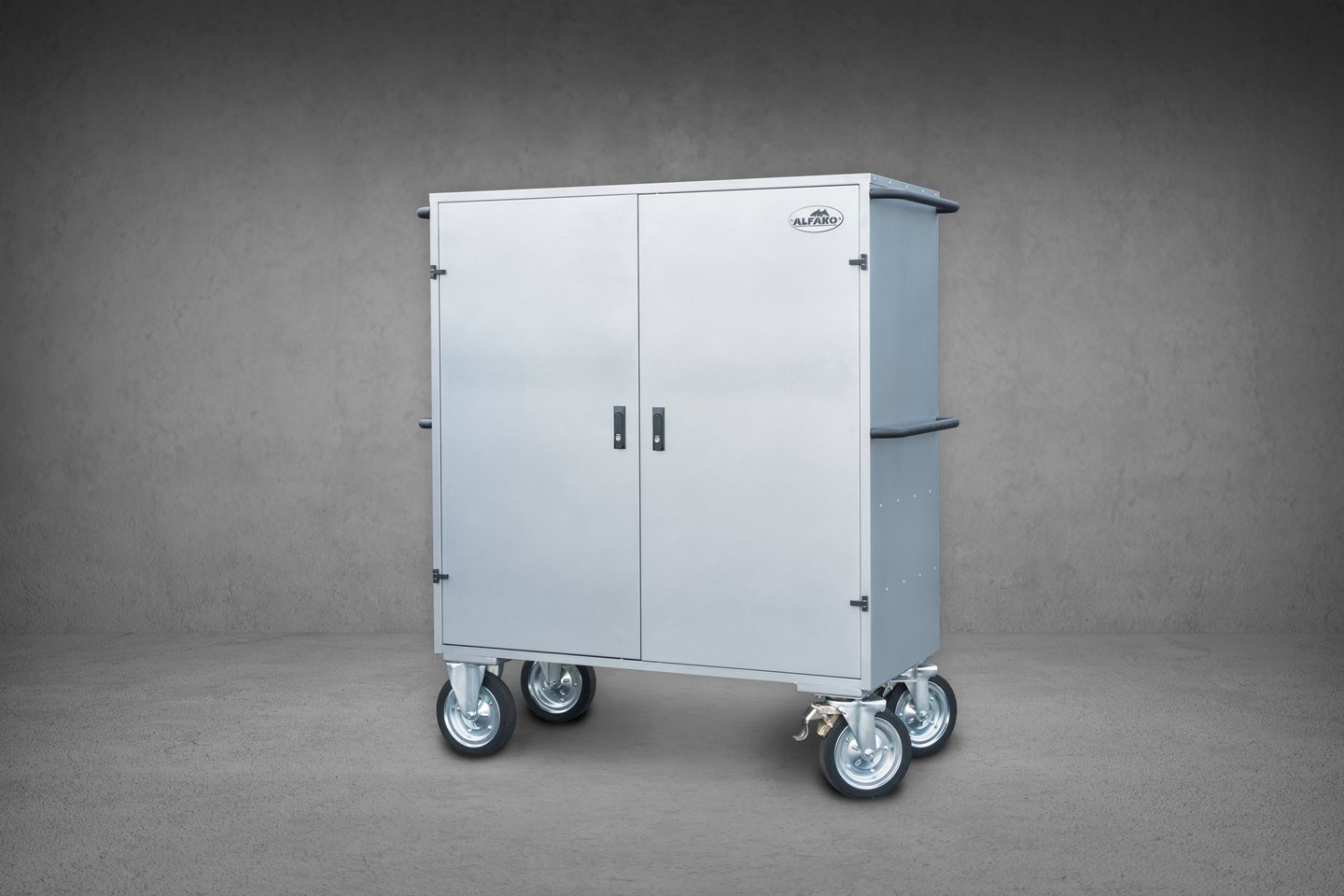 It features a lock for safety and is mounted on 4 wheels ⌀250 mm (2 fixed, 2 swivel), all with brakes — ideal for transport at shows or in the stable.