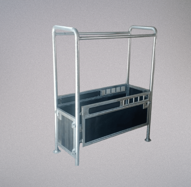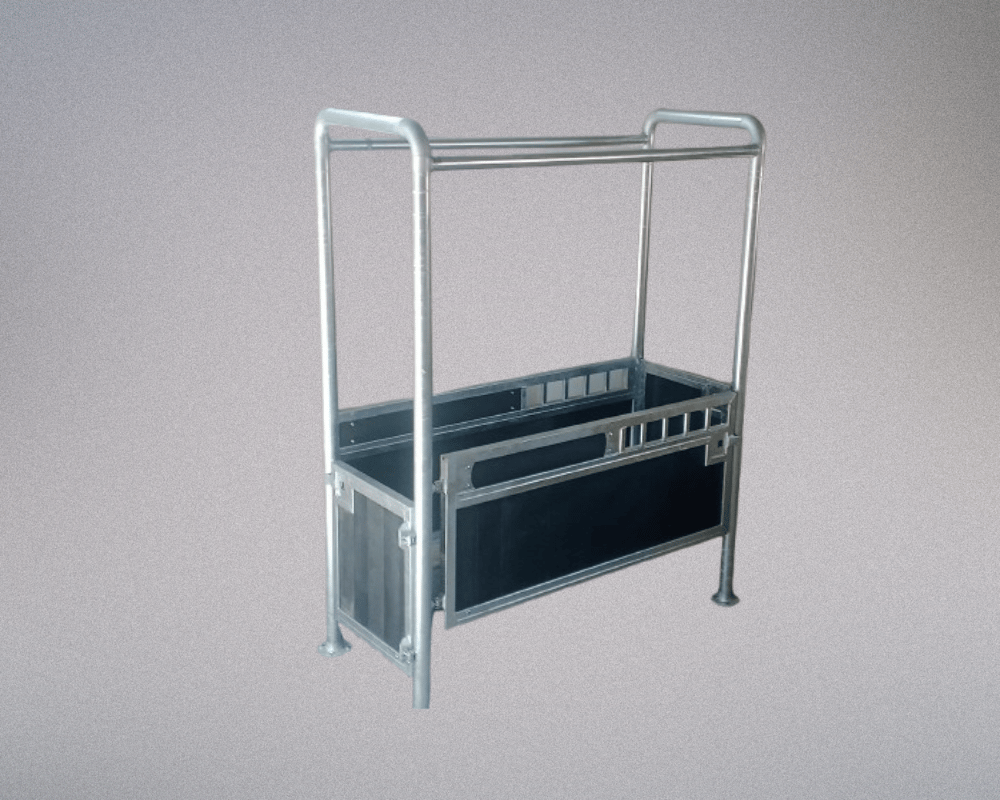 Tronco de contención para équidos, con capacidad para un caballo. Fabricado en tubo metálico de perfil redondo con 3,2 mm de espesor, galvanizado en caliente, con puertas en ambos extremos y apertura lateral a lo largo de todo el tronco.