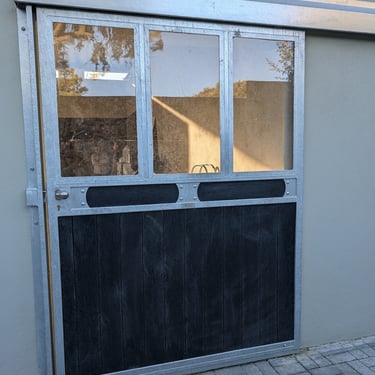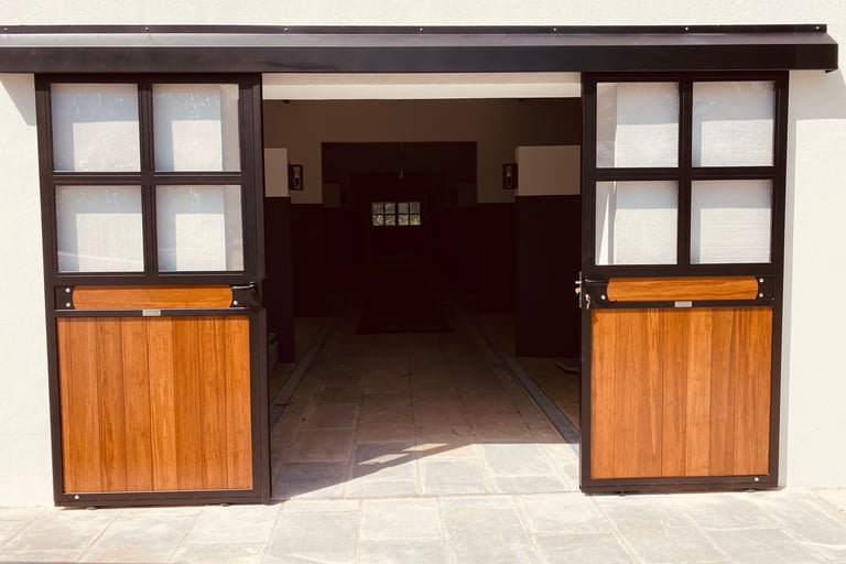 Portões para a entrada do seu estábulo personalizados à sua medida, conforme as necessidades do seu espaço. Podendo ter um acabamento galvanizado ou galvanizado e lacado na cor pretendida e ter tábuas em compósito plástico de 32mm ou em bambu.