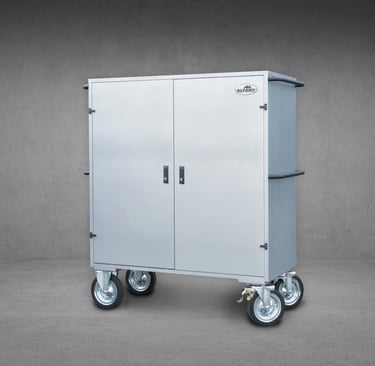 Possui uma fechadura para que o seu material esteja seguro e é apoiada em quatro rodas de ⌀250 sendo que 2 são fixas e 2 são rotativas, todas elas com sistema de travão, para facilitar o transporte em competições ou no estábulo.