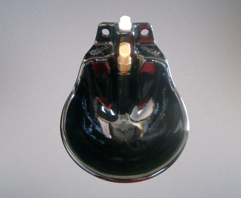 Bebedouro com design elegante fabricado em ferro fundido com acabamento a preto esmaltado. Este bebedouro funciona a partir de uma válvula de toque nasal.
