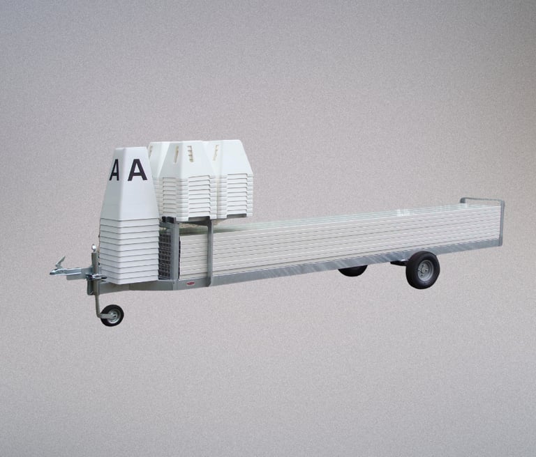 Este Trailer é o ideal para armazenar e transportar todos os acessórios da arena de ensino. As réguas e os cones podem ser colocados no reboque de forma rápida e segura, sendo que existe um espaço também para um conjunto de cones para letras na frente do trailer. Este trailer é facilmente rebocável por um mini-trator ou moto-4.
