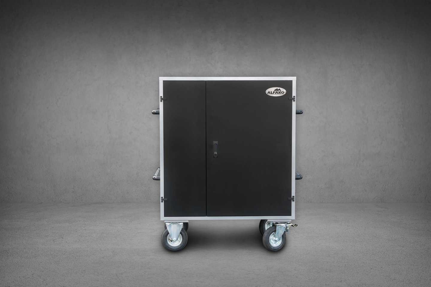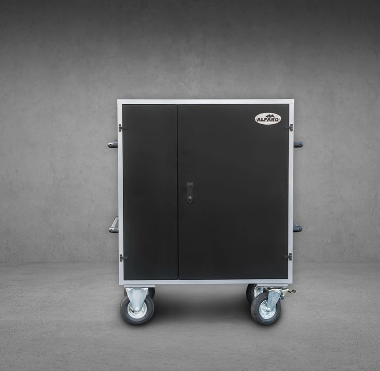 Montée sur 4 roues ⌀160 mm (2 fixes, 2 pivotantes), toutes avec frein.